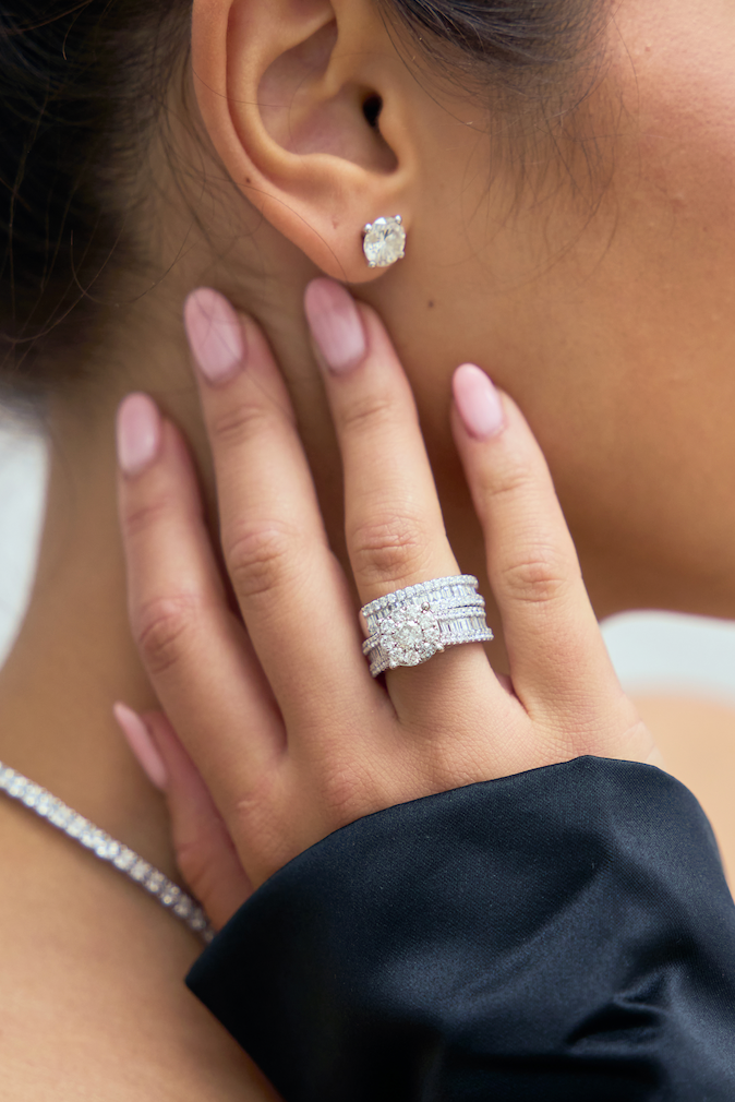 This gorgeous bridal set features shimmering round and baguette diamonds that extend halfway around both rings.