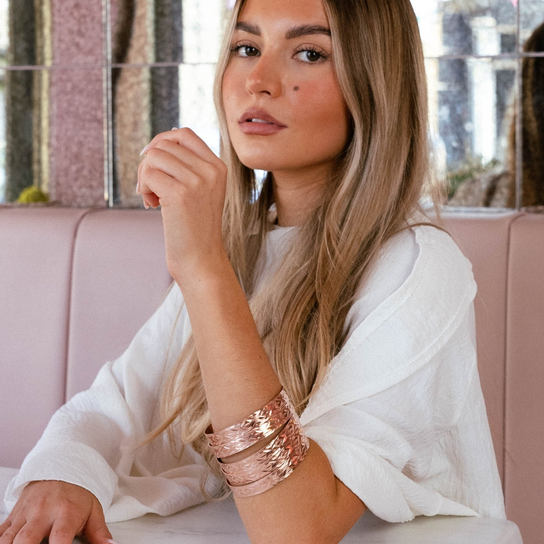 A luxurious and elegant solid gold bangle crafted in white, yellow or rose gold. Designed to be worn in stack, these bangles embellish the wrist with their sophisticated look. Available in 2 sizes with a cut and carved finish.