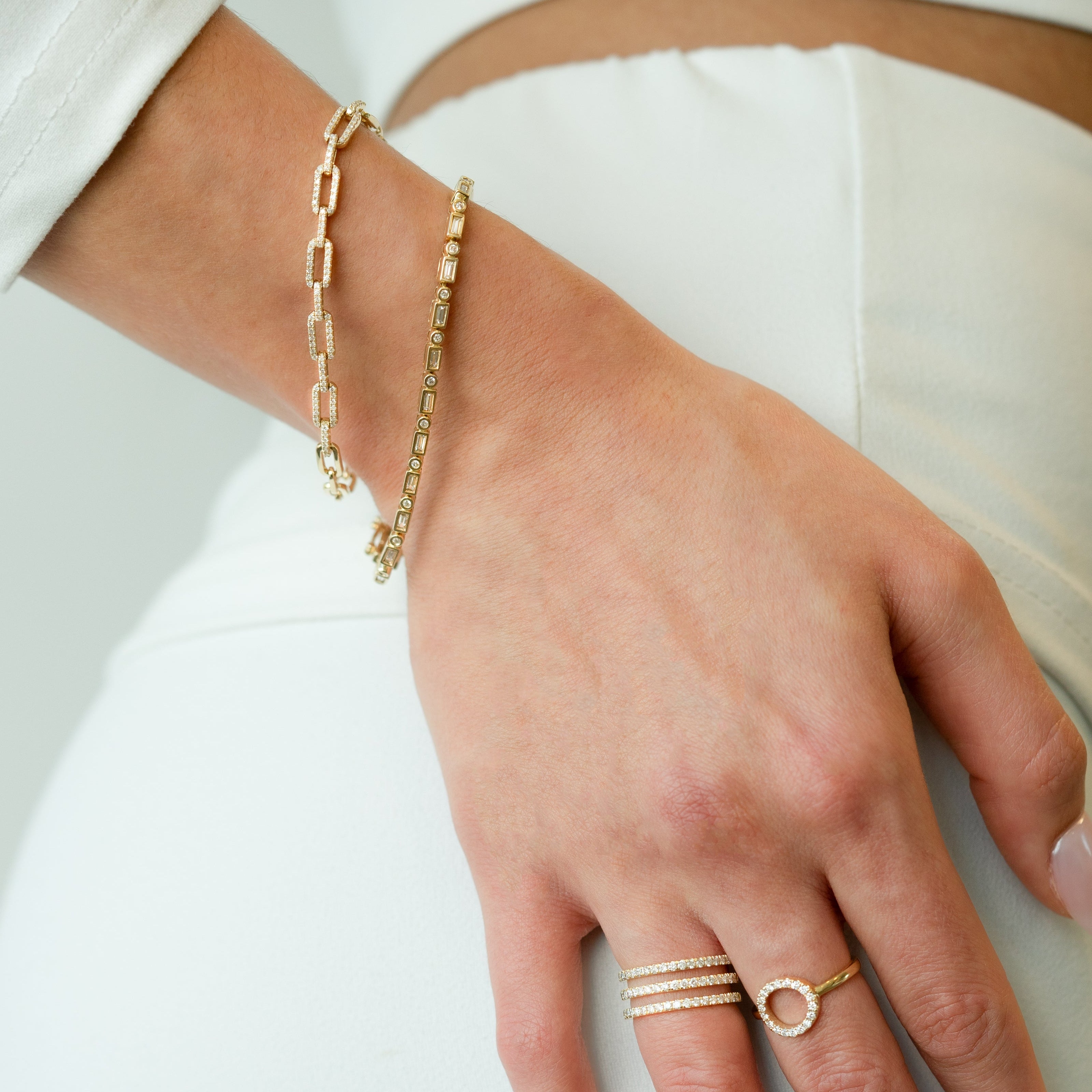 Gorgeous baguette and round diamond tennis bracelet. This jewellery piece will be the elegant addition to your jewellery collection. Perfect on its own or in a chic stack, this sparkly bracelet will complete any outfit.