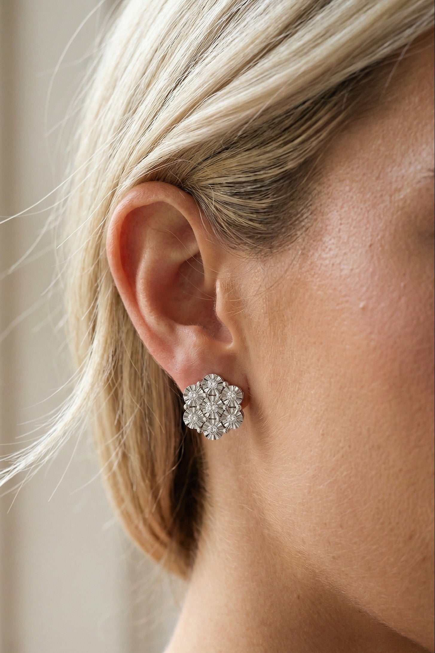 Beautiful and delicate flower studs with round diamonds in an illusion setting, enhancing their natural sparkle.